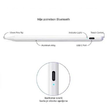 O trošku kupcaSNIŽENJE-NOVA Olovka za tablet bele boje, sa punjačem, ulaz C, indikatorom za punjenje, za lagano pisanje ili crtanje po tabletu. Nova, nekorištena.Olovka za iPad/Tablet XO-ST-03 Active Magnetic Capacitive Pen praktičan je dodatak koji će uvelike pojednostaviti korištenje iPada ili tableta omogućujući vam jednostavno obavljanje složenih zadataka koji zahtijevaju visoku preciznost, na primjer, u igrama, grafičkim i kancelarijskim aplikacijama. Model je izveden u modernom dizajnu, ističe se malom težinom i debljinom, udobno leži u ruci i ne stvara nelagodu tokom dugotrajne uportebe. Telo uređaja ima površinu ugodnu na dodir, izrađenu od aluminijske legure, neki dijelovi njegovih krajeva izrađeni su od izdržljive plastike. Njegov zamenjivi vrh, debljine oko 1,45 mm, izrađen je od poliacetala (POM) – otpornog na habanje, prilično tvrdog materijala koji ne grebe ekran simulirajući osjećaj obične olovke prilikom pisanja. U gornjem dijelu olovke nalazi se Type-C konektor za punjenje njegove ugrađene baterije kapaciteta 130mAh.