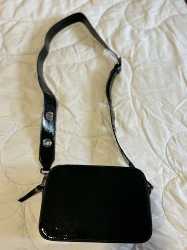 Crna elegantna torba preko ramena sa preklopom i metalnom kopčom. - Materijal: sjajna koža/, glatka tekstura sa diskretnim talasastim šarama. - Dizajn: pravougaoni oblik, čvrst preklop, metalni d...