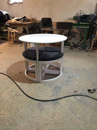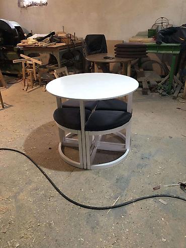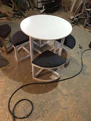 U paketu: okrugli sto + 4 tapacirane polukružne stolice koje se uvlače ispod stola.