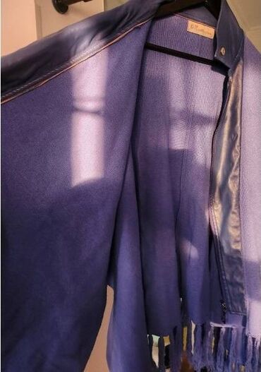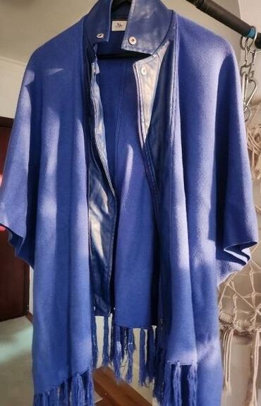 Drugi proizvođačSNIŽENJE-Pončo od trikotaže, sa umetkom kožnog napred dela gde je cibzar za kopčanje. Kragna kožna. Divno plave boje. Rese na rubovima. Rukavi 3/4.Nošen, ali očuvan.