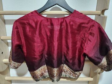 Crop bluza, kupljena u Indiji, materijal viskoza svila, uni veličine, na raskopčavanje, stoga je lako nosiv kao lagani ogrtač uz neku haljinu. Luksuznog izgleda i prefinjenog kvaliteta, sa ombre nijansama bordo boje i zlatnim koncem vezeno na rubovima rukava i na dnu leđa.Jednom nošeno.