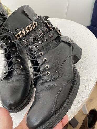 - Dekoracije: remenje oko članka sa metalnim nitnama, piramidalnim šiljcima i lančanim detaljem; dodatne metalne nitne oko pete