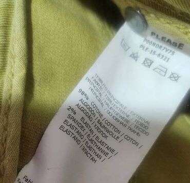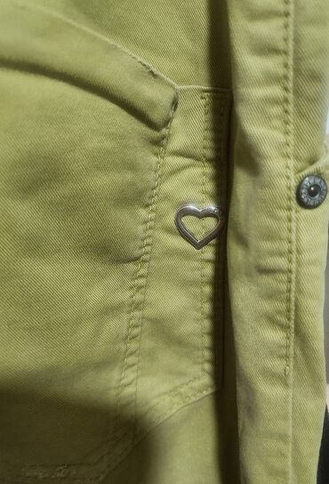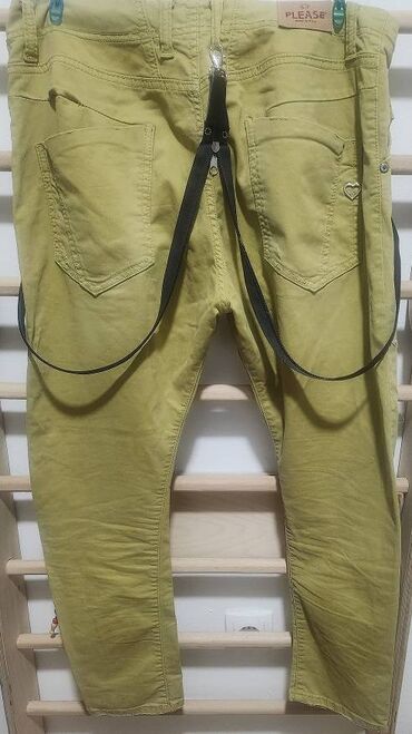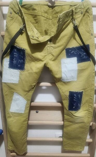 SNIŽENJE-Baggy farke, M veličina, sa kožnim tregerima, neobične, oker-zelene boje sa prišivenim aplikacijama duž nogavica u vidu teksas prišivenih detalja, a na zadnjem delu kod džepa je srce. Od pamuka i elastina. Slabo nošene, savršeno očuvane.