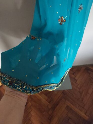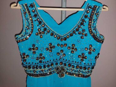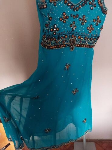 fantastična, tamno tirkizna haljina, sa puno našivenih perlica bakarne boje i boje starog zlata.