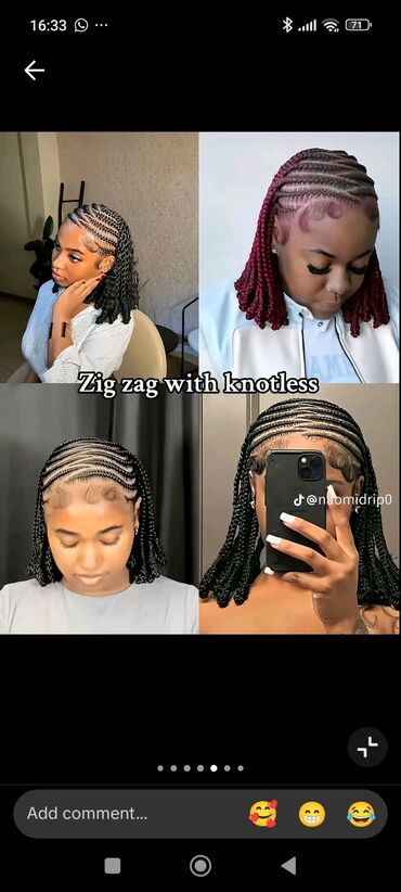 - Zig-zag kukičane pletenice sa knotless tehnikom: precizni talasasti razdeljci, glatko polaganje beby dlačica, dužina do ramena ili duža, ravne ili uvijene završnice, više boja (crna, bordo, kombinacije sa svetlijim pramenovima).