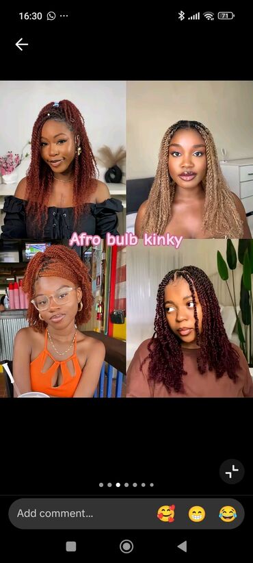 - Afro bulb kinky: teksturisane mini-twist/pletenice sa „bulb“ završetkom, vazdušaste i lake, mogu se nositi raspuštene ili polupodignute, u više toplih i hladnih tonova.