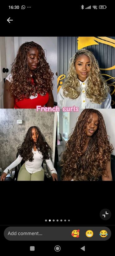- French curls: sitne box/knotless pletenice sa bogatim francuskim loknama, puna zapremina i meko kretanje, prirodan sjaj, razne nijanse (plavuš, karamela, čokolada).