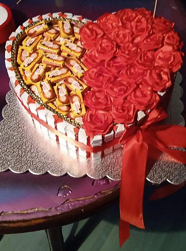 - Bočne stranice ukrašene nizom Kinder čokoladica postavljenih uspravno oko celog srca.
