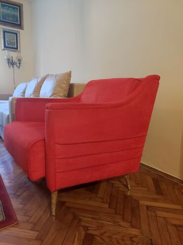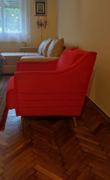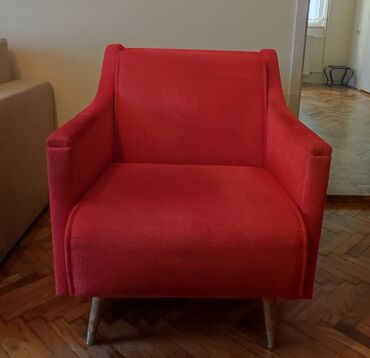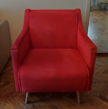 Crvena fotelja na nogicama stilska ,,,,žičani jezgro,,,,stilska,,, koristim je u kući čisto - Materijal: tkanina u crvenoj boji, meka i prijatna na dodir - Dizajn: ravno, visoko naslonjalo za stab...