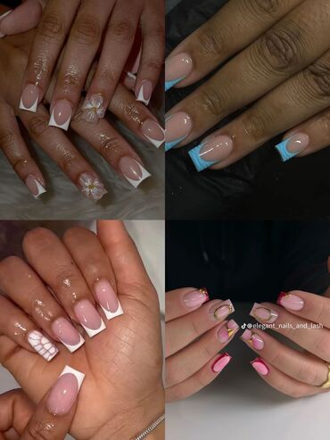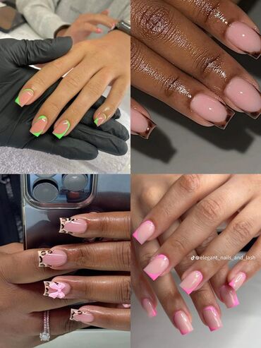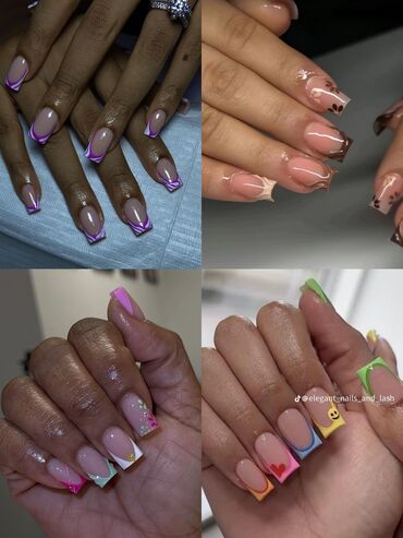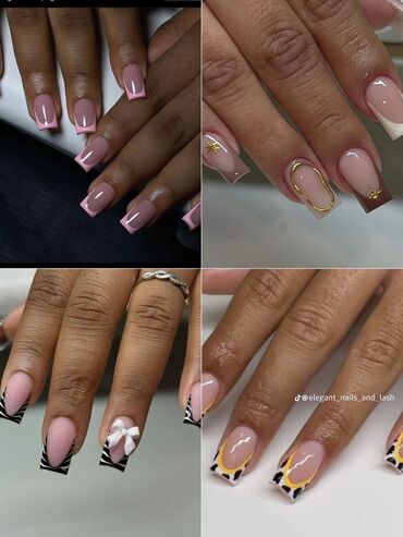 - Dizajn: francuski vrhovi u beloj, crnoj, roze, plavoj i zlatnoj varijanti; ombre i stakleni efekti; minimalističke linije; animal print; geometrija; negative space.