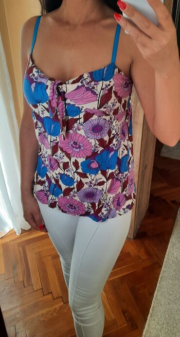 Cvetna letnja majica odlicnog materijala sa plavim bratelama koje se podešavaju.