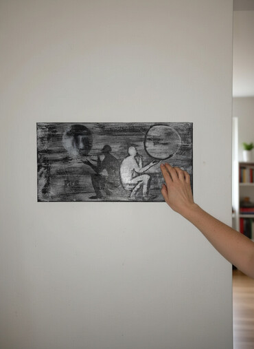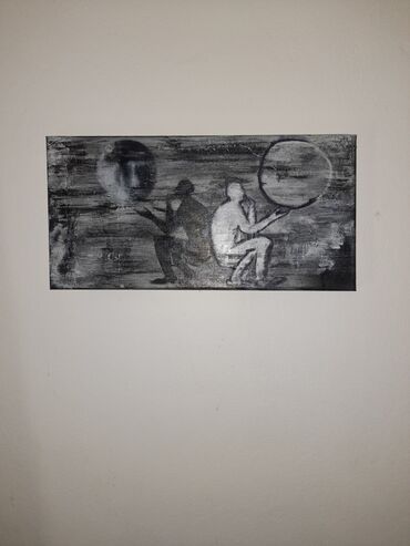 Ručno rađena slika na platnu – monohromatska (crno‑siva skala). Horizontalni format pravougaonog oblika. Motiv: tri figure u meditativnim/posmatračkim pozama, sa kružnim oblicima koji podsećaju na mehure ili planete; pozadina teksturisana sa slojevima boje koji stvaraju dubinu i efekat magle. Tehnika izgleda kao akril na platnu sa vidljivim potezima i patinom.