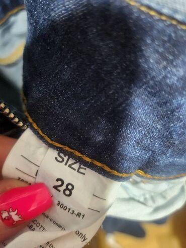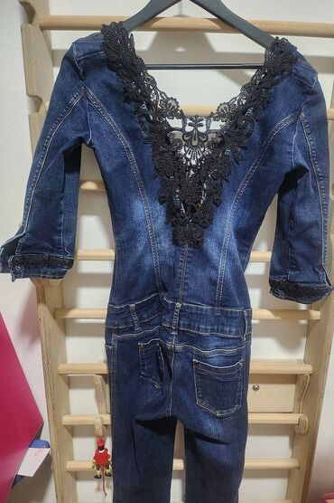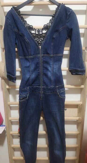 Neobican teksas kombinezon , tri cetvrt rukava, sa cipkom duz ledja, veoma efektan i fantasticno stoji, isticuci sve obline. Velicina je 28. Teget boje sa crnom cipkom.Nenosen, samo proban.