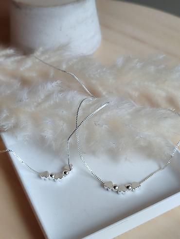 Elegantni komplet od srebra 925, sastavljen od ogrlice i narukvice sa istim dizajnom. Fini boks lančići nose centralni niz sitnih elementa: tri minimalistična srca od srebra i dve polirane kuglice koje daju suptilan sjaj.