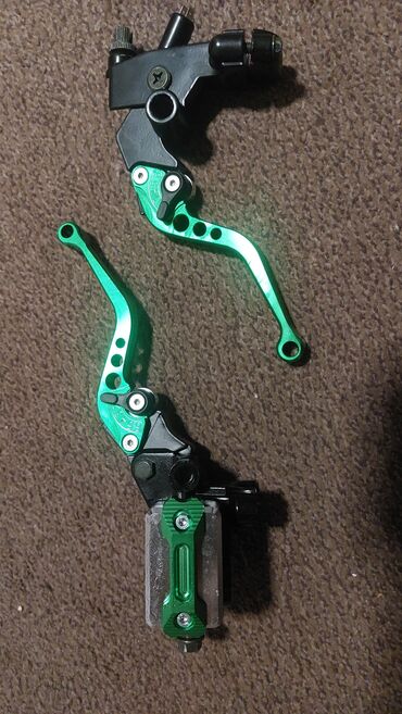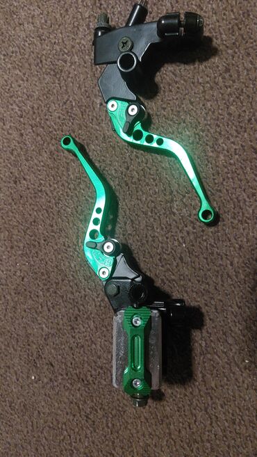- Ručice kočnice i kvačila (par) sa kućištima: aluminijumske, anodizovane zelene boje, perforirane sa podešavanjem dometa. Jedna ručica sa glavnim kočionim cilindrom i providnim rezervoarom tečnosti, dekorativni poklopac rezervoara u istoj zelenoj boji.