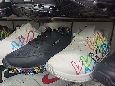 - Dizajn: moderne Lifestyle/Sport patike sa karakterističnim Skechers logom; dostupni jednobojni modeli (crna, bela, bež) i edicije sa grafiti/heart print motivima i šarenim detaljima oko đona.