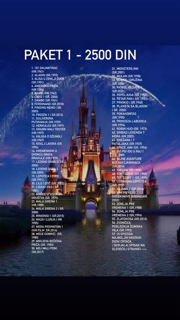 Dizni sinhronizovani crtani filmovi "PAKET 1". Pored naziva filmova, nalzi se i jezik na kojem