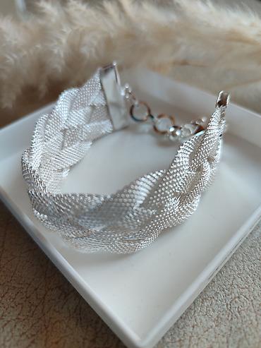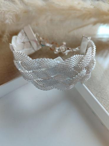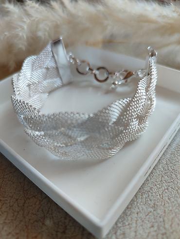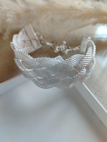 Diskretan, ali upadljiv akcenat na zglobu zahvaljujući trodimenzionalnom pletenom uzorku i refleksiji svetla na finom srebrnom tkanju.