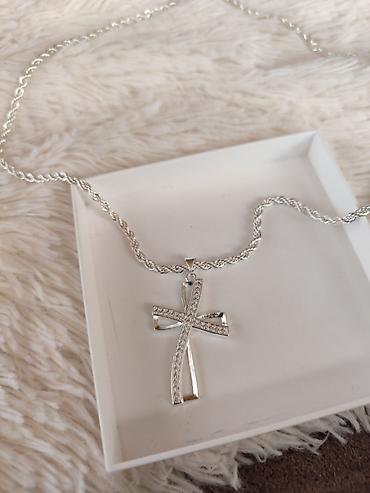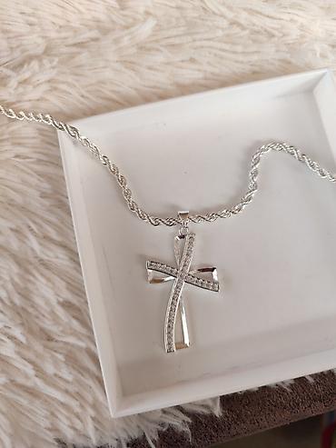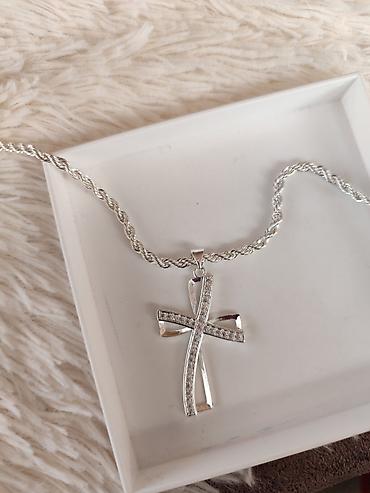 - Privezak: moderan krst od isprepletenih linija; jedna linija glatko polirana, druga ukrašena sitno fasetiranim cirkonima za diskretan sjaj