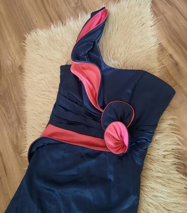 Elegantna večernja haljina – crna, duga, sa dramatičnim šlepom i visokim šlicem. - Kroj: sirena/suknja sa naborima napred, visoki otvor na butini, produženi asimetrični šlep sa strane. - Gornji de...