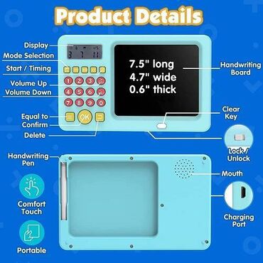Tablet za učenje matematike sam zadaje računske operacije prilagođene dečijem uzrastu.Kada mališani unesu ispravan rezultat čuje se pozitivan zvuk i muzika,što utiče na samopouzdanje dece. Ovo omogućava bezbroj različitih kombinacija brojeva i napredak deteta. Pred decu stavlja 6 matematičkih igara (sabiranje,oduzimanje, množenje, deljenje, igra memorije. više-manje),krećući se od osnovnih do kompleksnijih zadataka.Prilagođen deci,tako da ne morate brinuti o zračenju koje postoji kod običnih tableta i telefona.Dugotrajna baterija i kompaktan dizajn. Roze boje, sa olovkom kojom može crtati i pisati po magičnoj tabli. Brisanje je jednostavno,pritiskom na dugme. Jedno punjenje nosi 8 sati igre. Sa njim deca imaju zabavne igre, uče matematiku, razvijaju logiku, rešavaju mat. zadatke, pišu i crtaju. NOVO