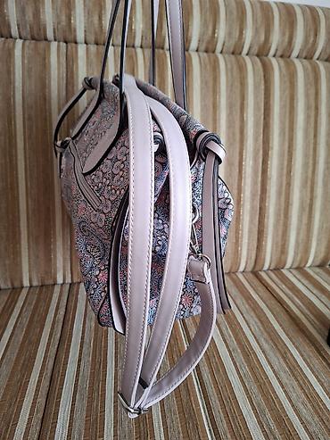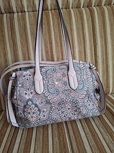 - Dizajn: bogat paisley i cvetni print u nežnim tonovima roze, teget i sive; detalji i ručke u svetloružičastoj boji
