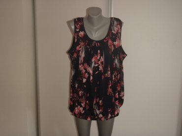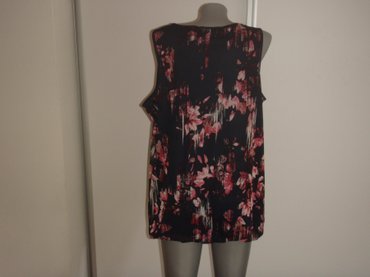 Bluza sa dugim rukavima i visokim okovratnikom, u upečatljivom žakard/dekorativnom tkanju. Osnova je zlatno-sjajna sa velikim plavim floralnim motivima po celoj površini. Prednji deo ima dekorativn...