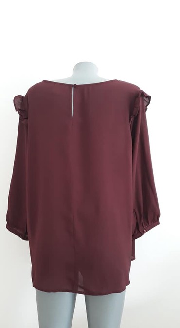 Svečana svetlucava bluza S/M Svečana bluza u bež nijansi, sa izraženim volanom preko ramena koji pada u talasima. Dugi rukavi, rastegljiv materijal sa blagim sjajem, prijatan na dodir. Model nagla...