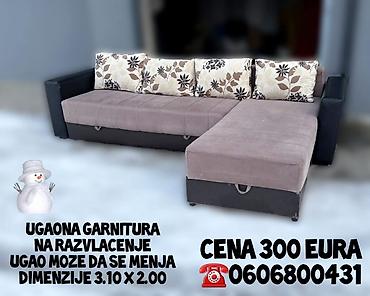 Ugaona garnitura sa ležajem i tabure-otomanskim delom. - Dimenzije: 250 × 160 cm (duža strana x kraća strana) - Sivi štof sa dekorativnim prošivima i geometrijskim šarama - Uključeni jastuci u viš...