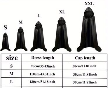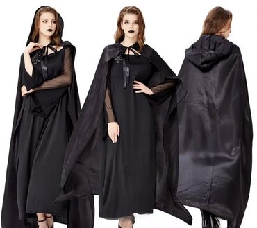 - Dizajn: široka pelerina sa dubokom kapuljačom i trakama za vezivanje ispod vrata; kroj omogućava lako oblačenje preko bilo koje odeće ili kostima.