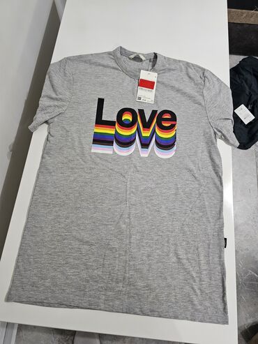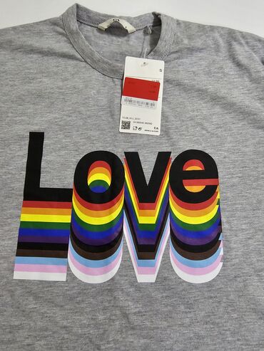 PamukSiva pamučna majica kratkih rukava sa printom „Love” u višeslojnom 3D efektu u bojama duge (uključuje i svetloplavu, roze i braon/crnu traku). Klasičan okrugli izrez, ravni porubi, meki dres materijal. Brend: C&A (etiketa na unutrašnjem šavu). Na prednjoj strani istaknut, kvalitetan štampani motiv. Veličina: S (naznačeno na visećoj etiketi). Idealna za svakodnevno nošenje i izražavanje podrške i pozitivnih vrednosti.
