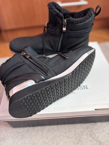 Moderne unisex zimske čizme u crnoj boji, dizajnirane za udobnost i toplinu tokom hladnijih meseci. Ove čizme imaju toplo krzneno punjenje, metalne detalje i patent zatvarač sa strane, što omogućava lako obuvanje i izuvanje. Đon je beli, sa crnim donjim delom, pružajući kontrast i stabilnost. Idealne su za svakodnevnu upotrebu, pružajući udobnost i stil u urbanim i zimskim uslovima. Pogodne su za različite prilike, od šetnji do opuštenih druženja.