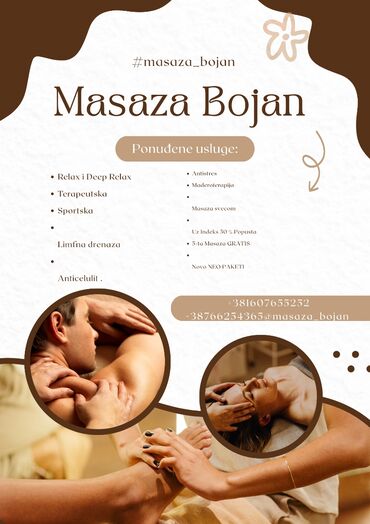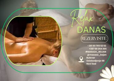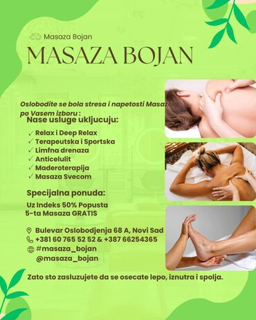 Masaza Bojan – profesionalne masaže po vašem izboru Usluge: - Relax i Deep Relax masaža - Terapeutska masaža - Sportska masaža - Limfna drenaža - Anticelulit masaža - Antistres masaža - Maderotera...