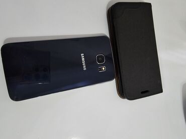 Na slikama je prikazan i Samsung telefon (Galaxy S6 serija) sa staklenom poleđinom u crnoj/teget boji i odgovarajućom preklopnom futrolom: