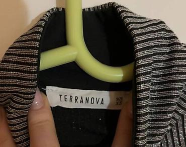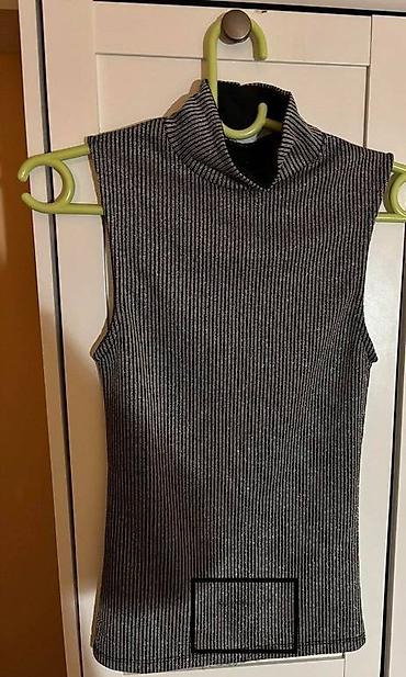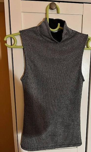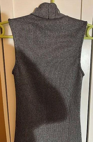 Terranova polurolka, crna osnova sa srebrnim površinskim končanim detaljima,rebrast materijal, tanja, bez rukava, lagana i jednostavna a efektna. Veličina XS. Nošena u par izlazaka, a jedini je deo kao blago oštećenje, što je malo pri dnu vidljiva crta pri savijanju (kako je suknja bila preko ), ali se vidi samo ako slikam sa strane pod svetlom odnapred se ne vidi. Na poslednjoj slici je obeleženo. Materijal je 85 % poliester, 10% metalik konac, 5% elastin.