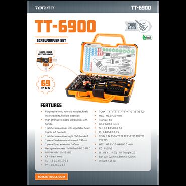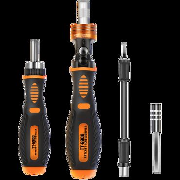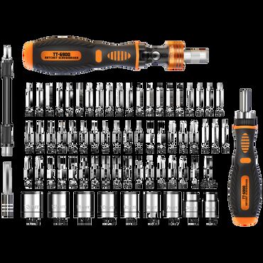 Za precizan rad, neklizajuće ručke, fino obrađeni alati + fleksibilni produžetak. Sve u jednom, što je neophodno za rad oko kuće. Zbog male veličine i male težine, može se poneti bilo gde. Kutija za skladištenje velike čvrstoće sa ručicom. Set sadrži:1 odvijač sa račnom i podesivom glavom (desni / levi smer) 1 odvijač (desni / levi smer) 1 komad fleksibilni nastavak: 130mm 1 komad fiksni nastavak: 60mm Ključ nasadni-gedora: M5.0 M6.0 M7.0 M8.0 M9.0 M10 M11 M12 M13 CR-V bit (4 mm): SL: 1.5 2.0 2.5 3.0 3.5 PH: 2.0 2.5 3.0 3.5 TORX: T3 T4 T5 T6 T7 T8 T9 T10 T15 T15 T20 HEKS: H2.5 H3.0 H4.0 Triangle: 3.0 CR-V bit (6,3 mm): SL : 3.0 4.0 5.0 6.0 7.0 PH: 4.0 5.0 6.0 6.5 TORX: T4 T5 T6 T7 T8 T9 T10 T15 T20 T25 T25 T25 HEX: H2.5 H3.0 H4.0 H5.0 H6.0 PZ: Pz2 Pz3 U:U6 I:I1 SK : R1 Triangle: 2.3