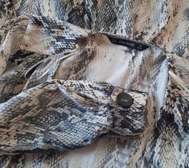 Haljina bez rukava, V-izrez napred i na leđima. A-kroj sa blago naborenim strukom koji lepo pada. Apstraktni print u crnoj, beloj i braon boji. - Veličina: M - Dužina: 80 cm - Poluobim grudi: 31–6...2 000 RSD