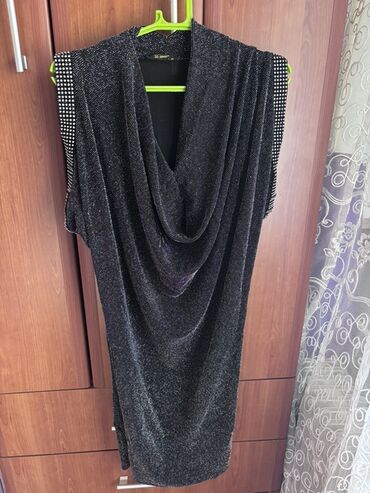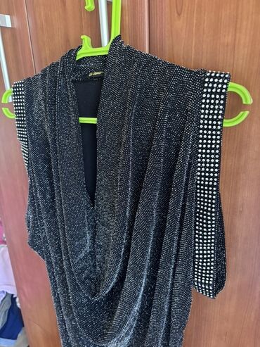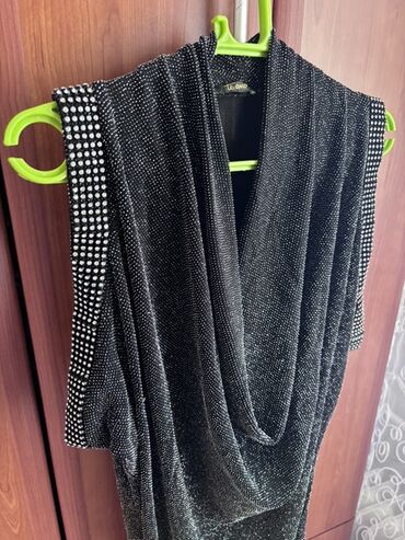 Ženska crna haljina sa svetlucavim česticama i preklopnim dekolteom. Elegantan dizajn naglašava siluetu, dok se na ramenima nalazi dekorativni detalj sa belim tačkama. Idealna za svečane prilike ili večernje izlaske. Mekan i udoban materijal pruža prijatnost tokom nošenja.