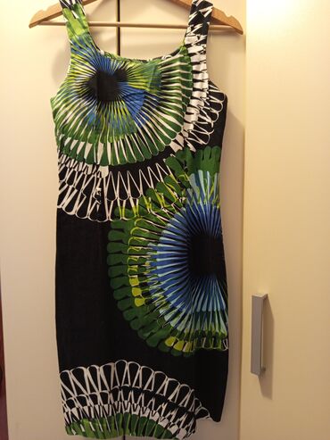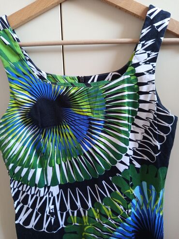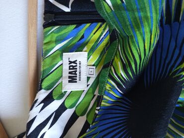 - Dizajn: upečatljiv geometrijski/psihodelični print u zelenoj, plavoj, beloj i crnoj boji; veliki koncentrični motivi preko cele površine