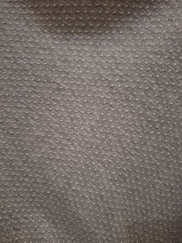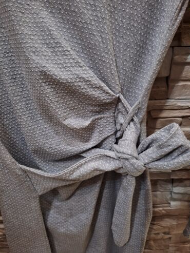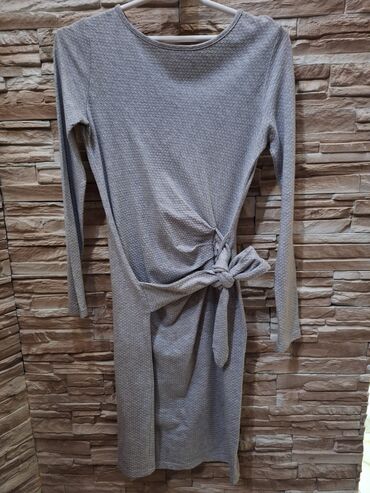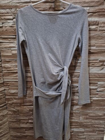 Siva ženska haljina sa dugim rukavima i teksturiranim dezenom sitnih tačkica. Model srednje dužine (ispod kolena) sa okruglim izrezom i efektom preklopa u predelu struka. Na boku se nalazi ugrađen kaiš koji se vezuje u mašnu, naglašava liniju struka i omogućava prilagođavanje. Tkanina je meka i elastična, prijatna za nošenje, pogodna za svaki dan ili poslovne prilike. Neutralna siva boja lako se kombinuje uz različite cipele i aksesoare. Veličina S, 36, NOVA.