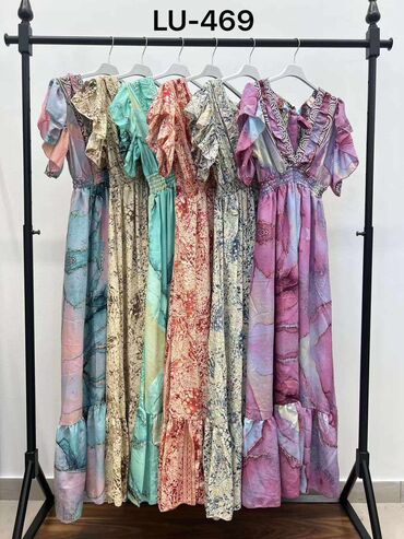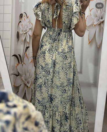 Duga haljina sa V-izrezom i kratkim, lepršavim rukavima. Haljina ima elastični deo u struku, što doprinosi udobnosti i prati liniju tela. Donji deo haljine je sa karnerom. Materijal je lagan, sa dezenom u svetlim nijansama plave i žute boje. Na leđima se nalaze trake koje se vezuju.