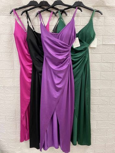 Elegantna satenska haljina u ciklama boji, sa tankim bretelama i preklopom u predelu grudi. Haljina ima prorez sa strane, što je čini idealnom za večernje izlaske ili posebne prilike. Dostupna je u više boja.