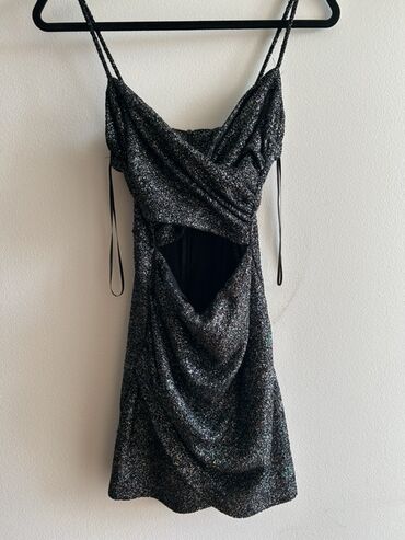Ova ženska mini haljina odlikuje se dubokim dekolteom i suptilnim prorezom na struku. Dizajnirana je sa tankim bretelama. Materijal haljine je crne boje sa sjajnim nitima koje joj daju privlačan svetlucavi izgled. Idealna je za večernje izlaske i posebne prilike.Materijal: svetlucav, rastegljivBroj/Veličina: EUR S (USA S, MEX 26)Boja: crna sa sjajnim nitimaStil: mini haljinaIzrez: duboki dekolteDetalji: prorez na struku, tanke bretele
