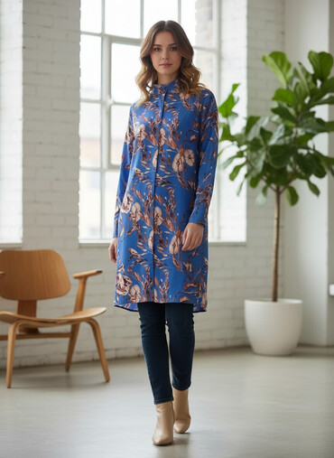 Napomena: Fotografije prikazuju stvarni print i nijansu – plava podloga sa floralnim dezenom; kroj je ravan, bez naglašenog struka.