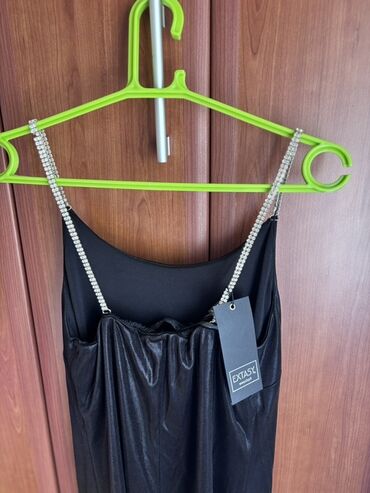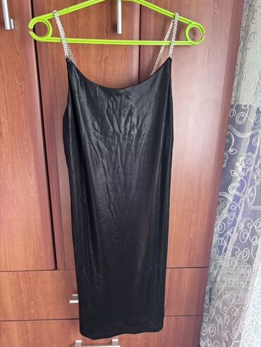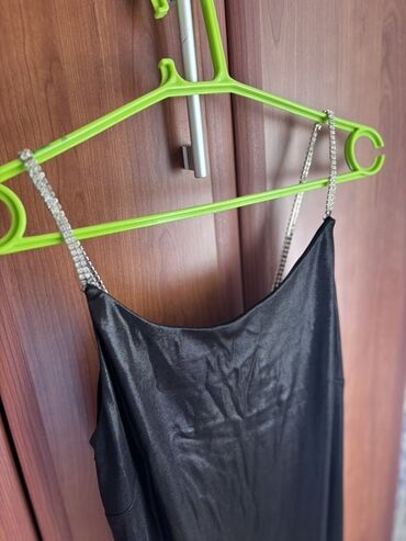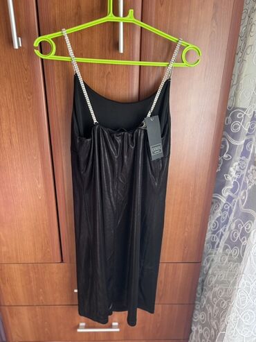 Crna mini haljina ravnog kroja, ističe se sjajnim izgledom materijala. Bretele su izrađene od svetlucavih cirkona, dodajući elegantan detalj. Pogodna za večernje izlaske ili svečane prilike. Lako se kombinuje sa različitim modnim dodacima.