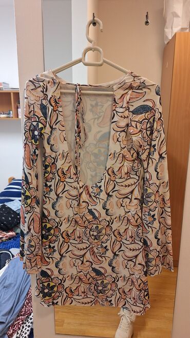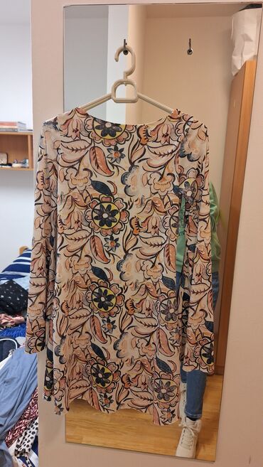 - Print: bogat cvetni motiv u bež osnovi sa tonovima breskve, tamnoplave, maslinaste i oker.