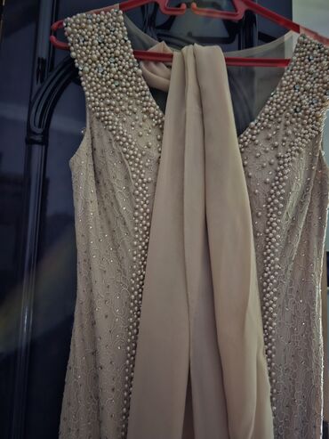 - Bogata ručna aplikacija bisera i sitnih perlica duž naramenica i bočnih linija, vizuelno sužava struk.
