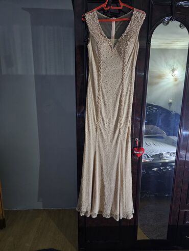 - Haljina u boji šampanjca, duga do poda, blago A-kroja.