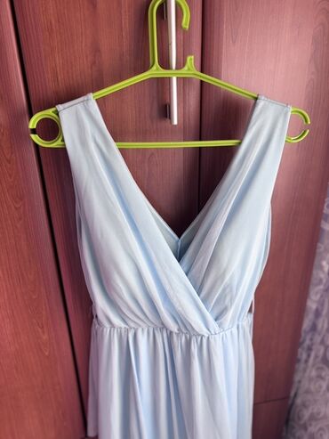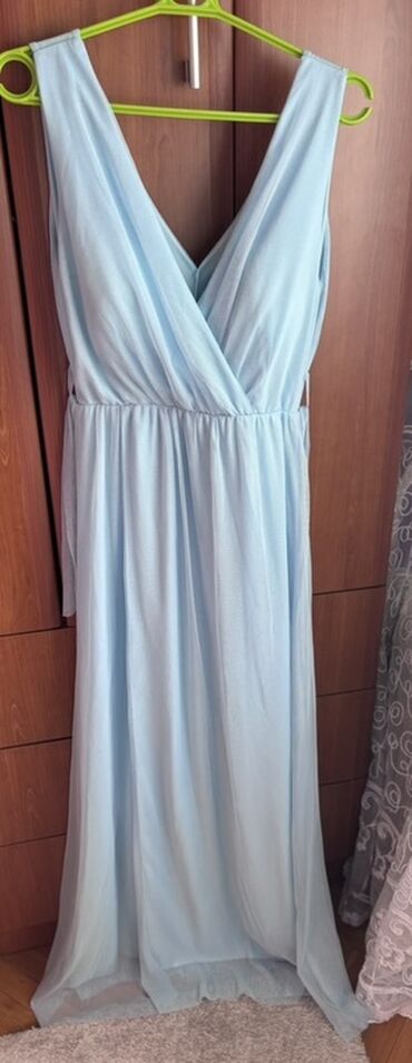 Elegantna duga ženska haljina u svetloplavoj boji, idealna za svečane prilike ili letnje događaje. Haljina ima duboki V-izrez na grudima i leđima, što doprinosi sofisticiranom izgledu. Struk je naglašen elastičnim delom, obezbeđujući udobno pristajanje. Izrađena je od laganog materijala koji lepo pada, stvarajući fluidnu siluetu. Pogodna je za razne proslave, venčanja ili večernje izlaske.
