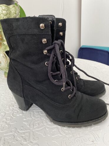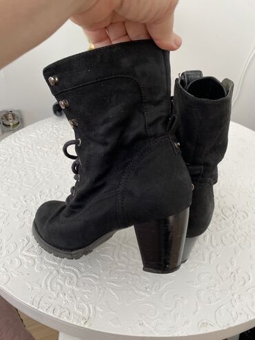 UpotrebljenоCrne ženske čizme na pertlanje sa blok potpeticom.